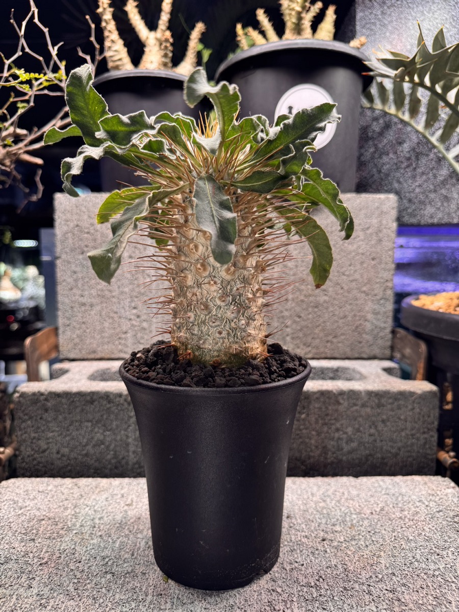 パキポディウムの中でも独特の風貌で、フリルのようにくねくねとした波打つ葉を茂らせ、表面はざらざらとしたマット調な質感です。